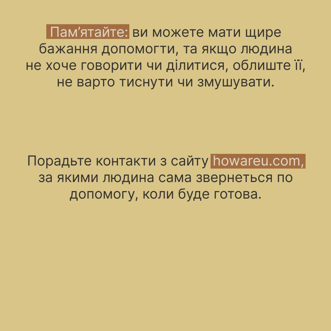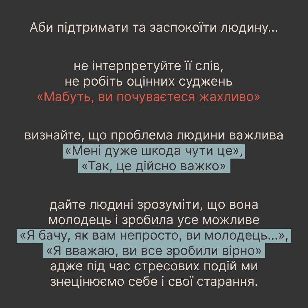 У цьому дописі ви знайдете кілька порад, як вислухати людину, яка пережила сильний стрес, що важливо проговорити і як не зробити гірше. Адже у такому стані вона не завжди готова розмовляти, а ваше щире бажання допомогти може викликати байдужість чи навіть агресію ✍🏻