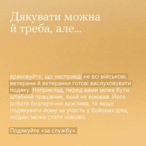 Буває, зустрічаємо військових або дізнаємося, що перед нами ветеран чи ветеранка, зринає думка — як подякувати людині за службу так, щоб не бути навʼязливим, не бовкнути зайвого, не образити?