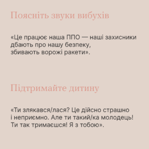 У будь-який час дня або ночі можуть залунати повітряна тривога, робота ППО чи звуки вибухів. Існує хибна думка, що дітям не потрібно пояснювати, що відбувається, а достатньо просто їх відволікти та сказати «не бійся». Насправді дітям важливі і пояснення, і підтримка дорослих.
